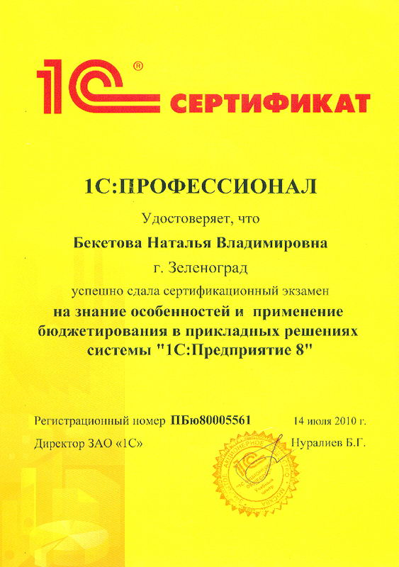 Бекетова Наталья успешно сдала сертификационный экзамен на знание особенностей и применение бюджетирования в прикладных решениях системы "1С:Предприятие 8"