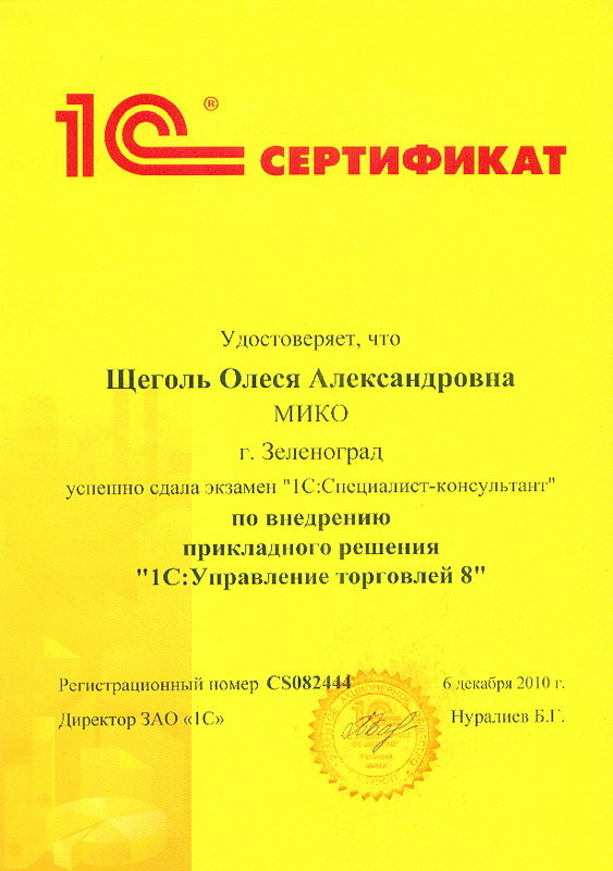 Щеголь Олеся успешно сдала экзамен "1С:Специалист-консультант" по внедрению прикладного решения "1С:Управление торговлей8"