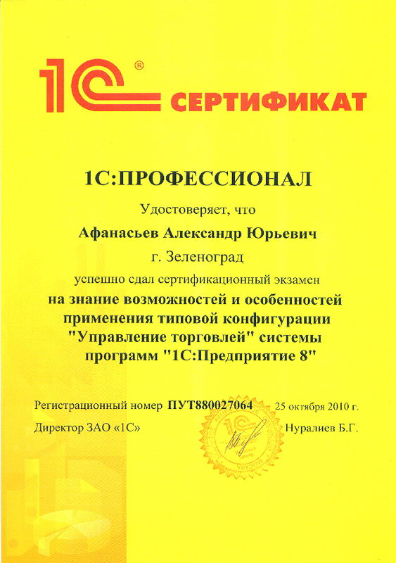 Афанасьев Александр успешно сдал сертификационный экзамен на знание возможностей и особенностей применения типовой конфигурации "Управление торговлей" системы программ "1С:Предприятие 8"