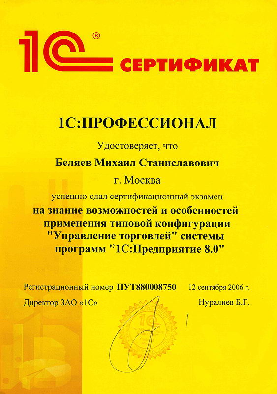 Беляев Михаил успешно сдал экзамен "1С:Специалист" по конфигурированию и внедрению подсистем расчета зарплаты и управления персоналом в прикладных решениях "1С:Предприятие 8"