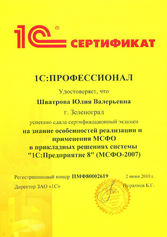 Шватрова Юлия успешно сдала сертификационный экзамен на знание особенностей реализации и применения МСФО в прикладных решениях системы "1С:Предприятие 8" (МСФО-2007)