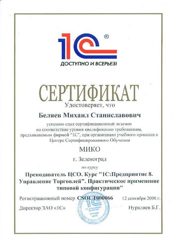 Бабаев Евгений успешно сдал сертификационный экзамен на соответствие уровня квалификации требованиям, предъявляемым фирмой "1С", при организации учебного процесса в Центре Сертифицированного Обучения по курсу Преподаватель ЦСО. Управление торговлей