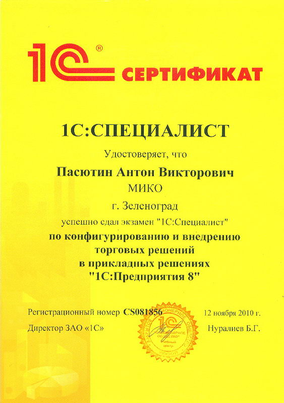Пасютин Антон успешно сдал экзамен "1С:Специалист" по конфигурированию и внедрению торговых решений в прикладных решениях "1С:Предприятия 8"