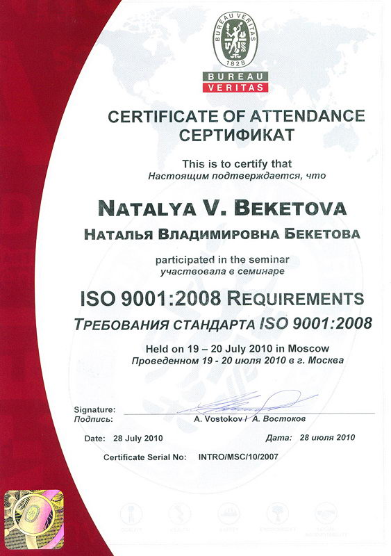 Наталья Бекетова участвовала в семинаре Требования стандарта ISO 9001:2008 Проведенном 19-20 июля 2010 в г. Москва