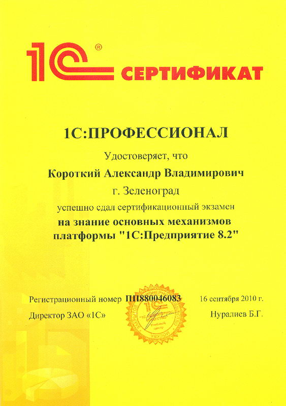 Короткий Александр успешно сдал сертификационный экзамен на знание основных механизмов платформы "1С:Предприятие 8.2"