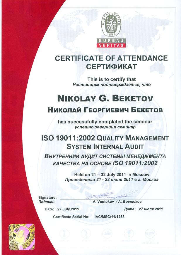 Николай Бекетов успешно завершил семинар Внутренний аудиты системы менеджмента качества на основе ISO 19011:2002