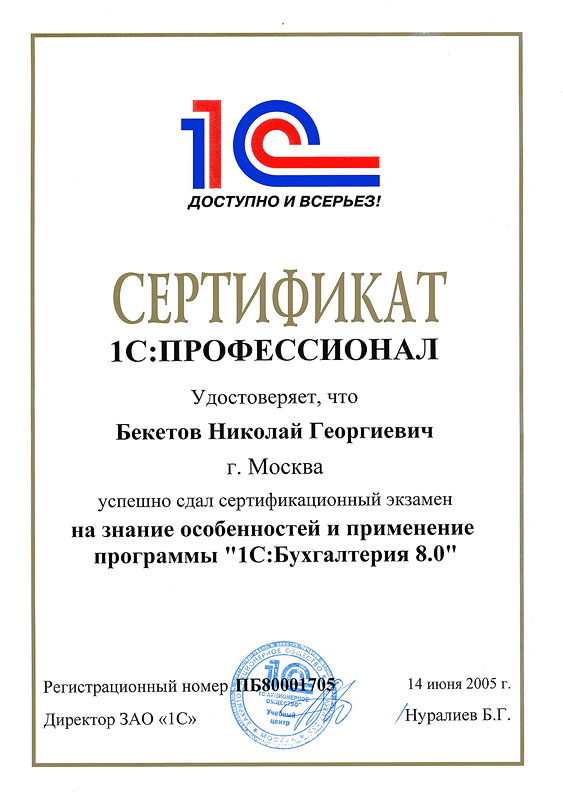 Бекетов Николай успешно сдал сертификационный экзамен на знание особенностей и применение программы "1С:Бухгалтерия 8.0"