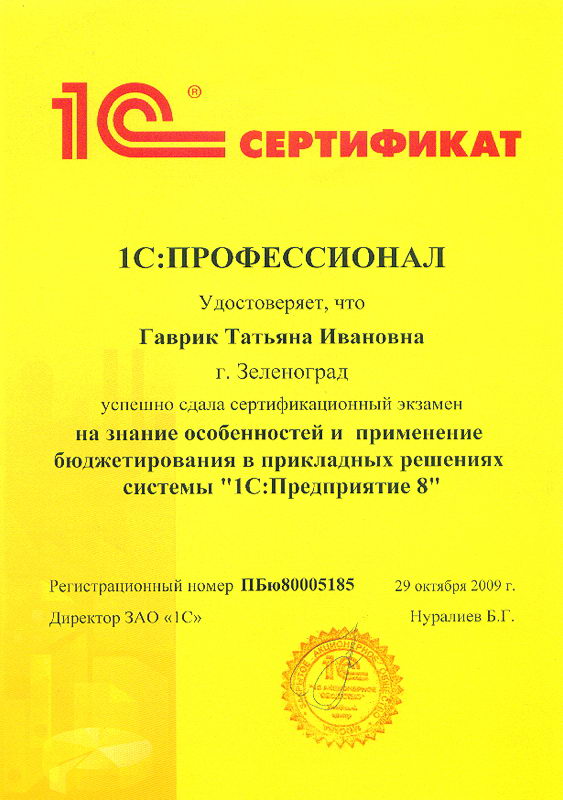 Гаврик Татьяна успешно сдала сертификационный экзамен на знание особенностей и применение бюджетирования в прикладных решениях системы "1С:Предприятие 8"