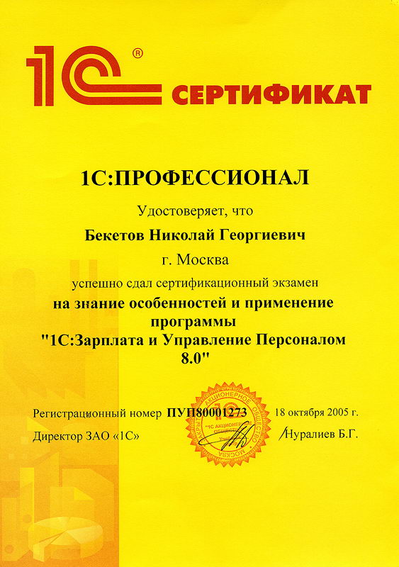 Бекетов Николай успешно сдал сертификационный экзамен на знание особенностей и применение программы "1С:Зарплата и Управление Персоналом 8.0"