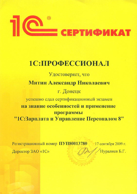 Митин Александр успешно сдал сертификационный экзамен на знание особенностей и применение программы "1С:Зарплата и Управление Персоналом 8"