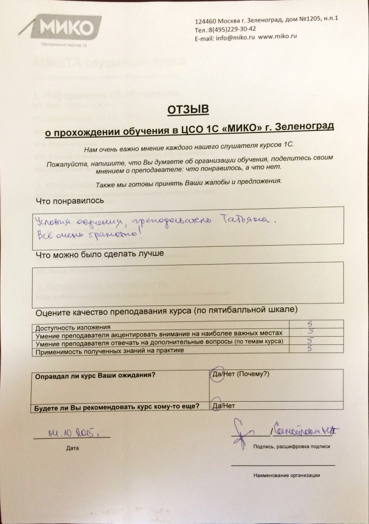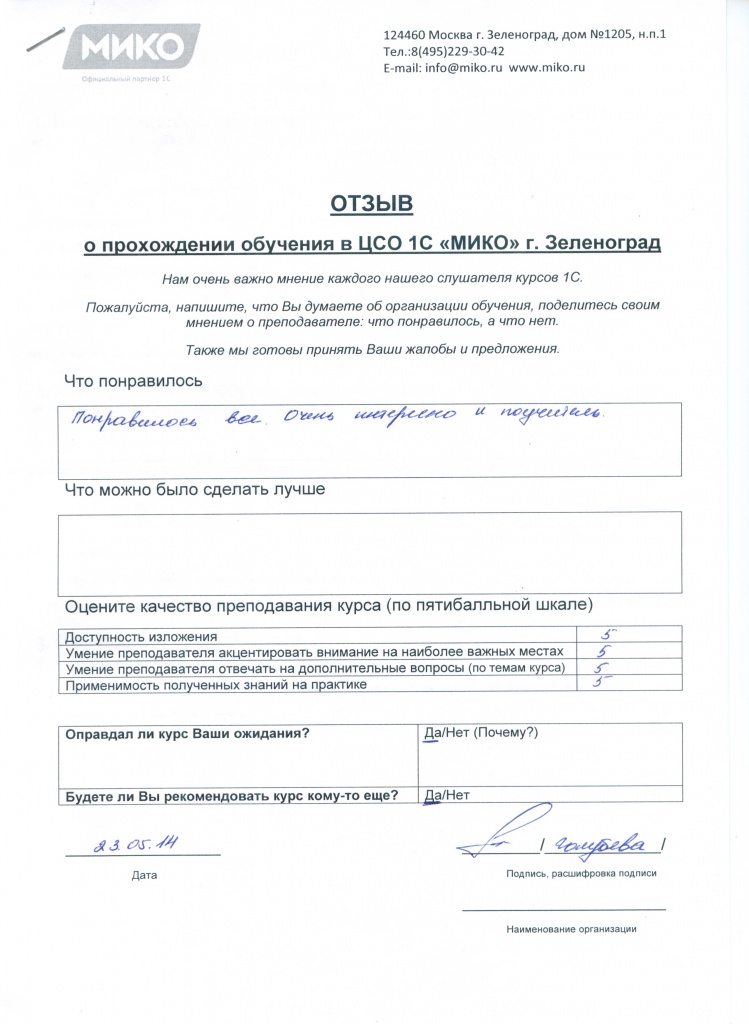 Обучение мы проводим по единым сертифицированным методикам и материалам. Курсы прочитаны сотни раз, обкатаны и проверены временем.Каждый слушатель получает методические материалы по курсу и оригинальное свидетельство фирмы "1С" о прохождении курса.