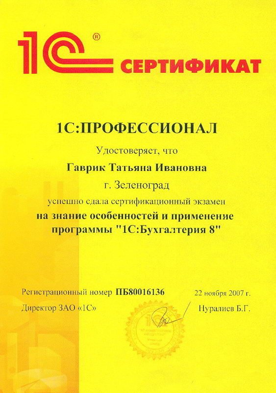 Гаврик Татьяна успешно сдала сертификационный экзамен на знание особенностей и применение программы "1С:Бухгалтерия 8"