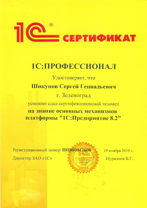 Шикунов Сергей успешно сдал сертификационный экзамен на знание основных механизмов платформы "1С:Предприятие 8.2"